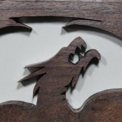 This image is cut from 1 3/8 inch walnut board backed with black paper. Due to the thickness of the board, I applied son router work to the edge.