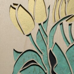 This image is inspired by van Gogh’s Irises series. I love the bold, crisp elements of his irises. I think that they lend themselves to expression in scroll saw art. Bold strokes aside, I think my favorite part of my image is the water line, visible through the clear glass vase. Although I think of tulips as yellow, I think red tulips are in my future, I already have the red paper picked out.